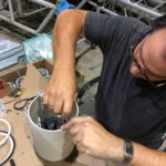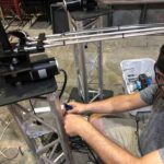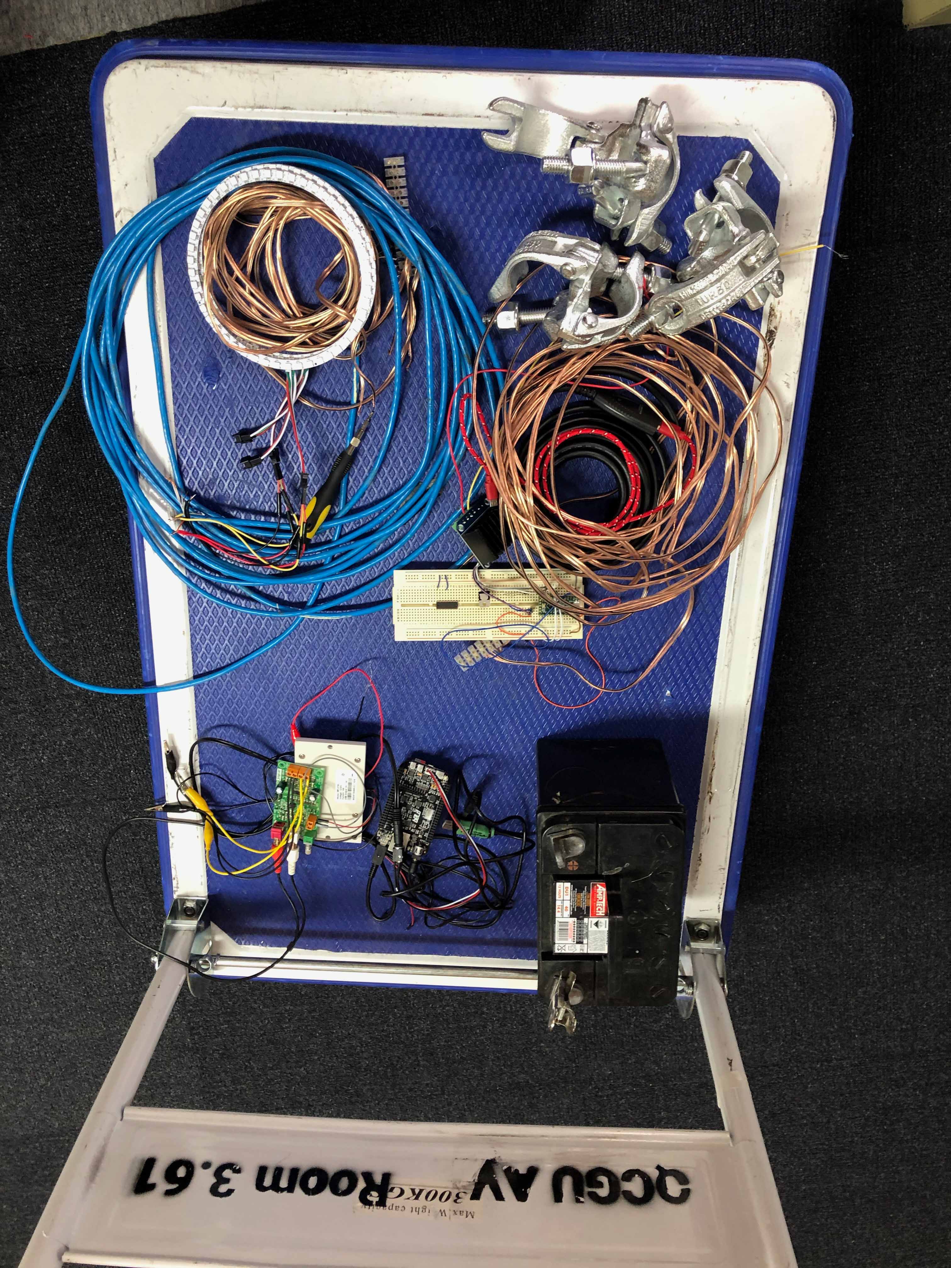 Various predefined compositional segments are activated by individually seeded random number generators so the length and order of each section is unpredictable, meaning the emergent composition is never the same twice. Each Scatter unit runs from a deep cycle battery that is charged by two solar panels, this enables Scatter to run after dark; in Brisbane during March sunset is before 6pm and the installation needed to run from 8am till 10pm every day, two solar panels provide sufficient energy to run the system and charge the batteries to full capacity before nightfall (this proved successful even when we experienced several wet and rainy days in a row). The sound-world is created digitally through a combination of audio samples and synthesis using graphical programming environment Pure data (Pd). This runs live (via libpd) on Bela Platform, with audio, motor speed and direction of rotation, and LED lighting all on Bela Platform. Additionally, a Teensy microcontroller is connected to Bela via USB in order to access the Neopixel library and control the LEDs via MIDI from Pd. A slip ring is utilised to feed power and signal through the motor axle to the moving rotor.