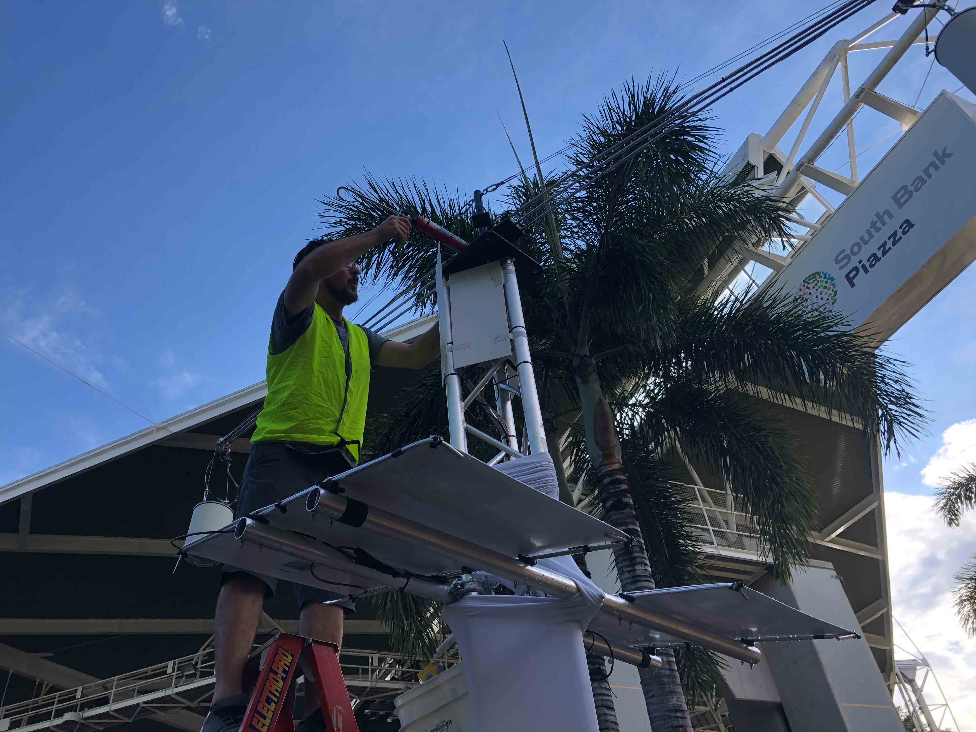Scatter 2019 is a solar-powered installation, sonic composition, and artistic research project by John Ferguson, Erik Griswold, Paul Bardini, and Daniel Della-Bosca. Sound emanates from twelve loudspeakers that hang from six motorised rotors, which are each mounted at a height of four metres on a freestanding structure. By walking and listening beneath and between each mechanism, visitors experience a unique sonic adventure. The project was commissioned by Tourism and Events Queensland through Brisbane Powerhouse for the inaugural Curiocity Brisbane Festival. In March 2019 Scatter was installed in the South Bank Parklands for a period of three weeks. Over 1000 visitors a day interacted with the installation and during World Science Festival Brisbane approximately 3000 visitors per day were counted. Scatter 2019 appeared courtesy of Queensland Conservatorium Research Centre and Queensland College of Art at Griffith University.